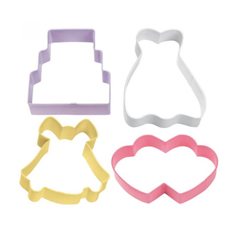 SET 4 CORTADORES "BODA" WILTON 8 CM APROX (CORAZONES UNIDOS, VESTIDO, TARTA Y CAMPANAS)