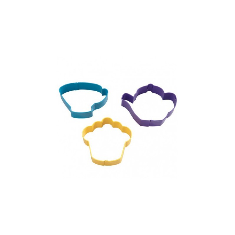 Set de 3 cortadores metálicos de colores de Wilton. Incluye cortador de cupcake, de tetera y de taza.