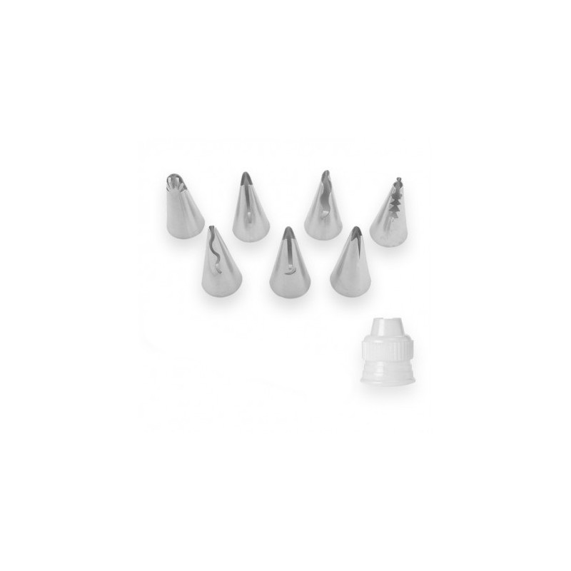 Set de 7 boquillas con adaptador y limpiador de boquillas, que permiten hacer diferentes tipos de volantes para ruffle cakes o cupcakes de forma muy sencilla.
