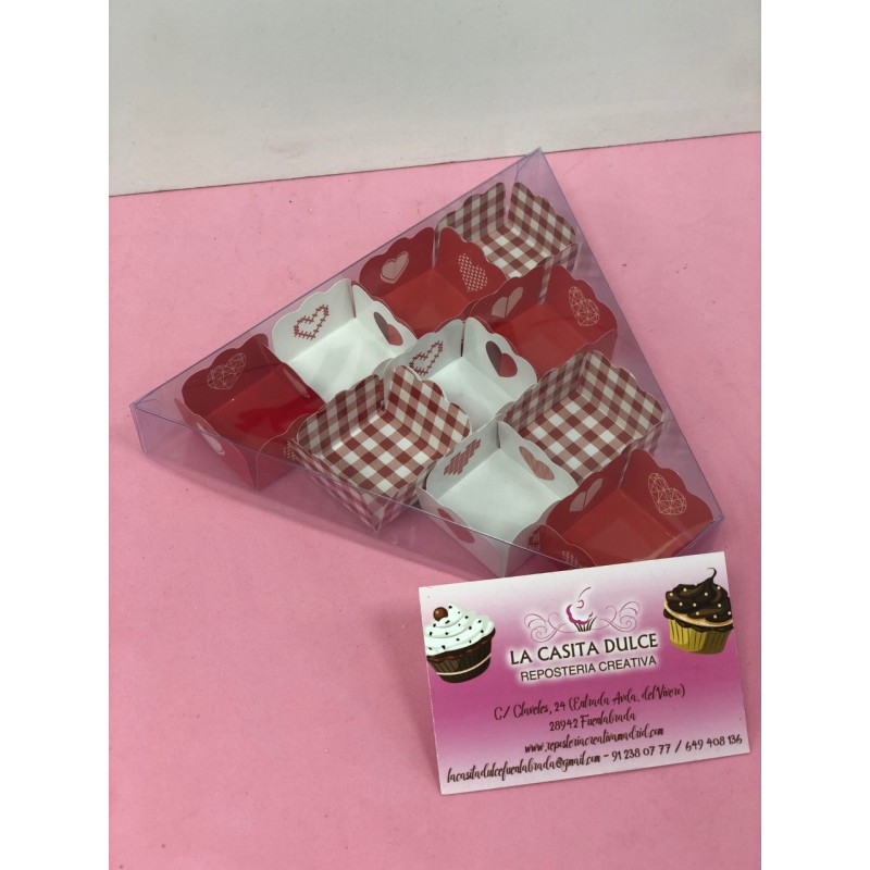 CAJA TRIANGULAR TRANSPARENTE DE PVC CON 10 BASES ROJAS Y BLANCAS DE CORAZONES PARA PETIT FOURS, TRUFAS, BOMBONES, MACARONS...