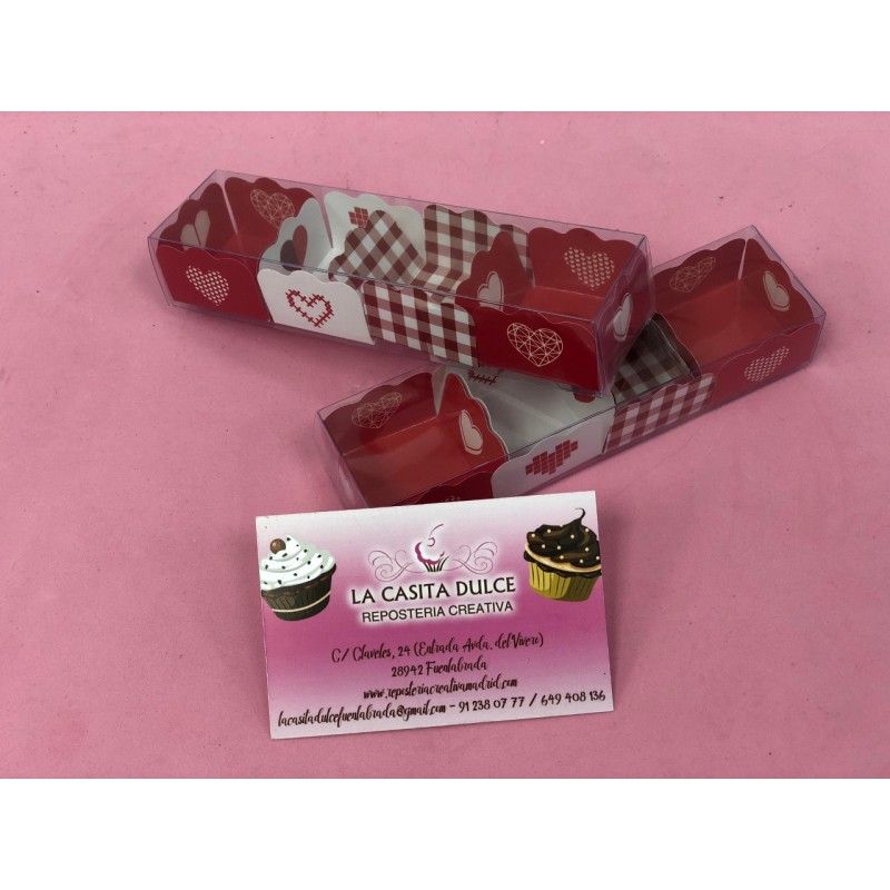 CAJA RECTA TRANSPARENTE DE PVC CON 4 BASES ROJAS Y BLANCAS DE CORAZONES PARA PETIT FOURS, TRUFAS, BOMBONES, MACARONS...