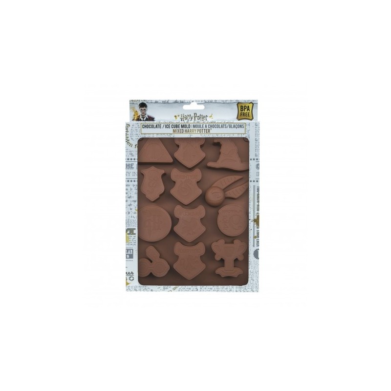 MOLDE DE SILICONA CON LOS ESCUDOS DE LAS CASAS DE HARRY POTTER (HUFFLEPUFF, SLYTHERIN, RAVENCLAW Y GRYFFINDOR), PLATAFORMA 9 3/4, SOMBRERO SELECCIONADOR, RELIQUIAS DE LA MUERTE, Y OTROS SIMBOLOS PARA CHOCOLATE HIELO GELATINA...