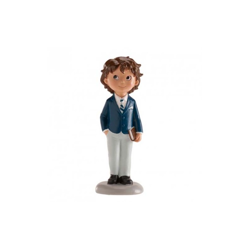 NIÑO COMUNION DESPEINADO CON TRAJE AZUL Y GRIS Y BIBLIA EN LA MANO 13 CM APROX