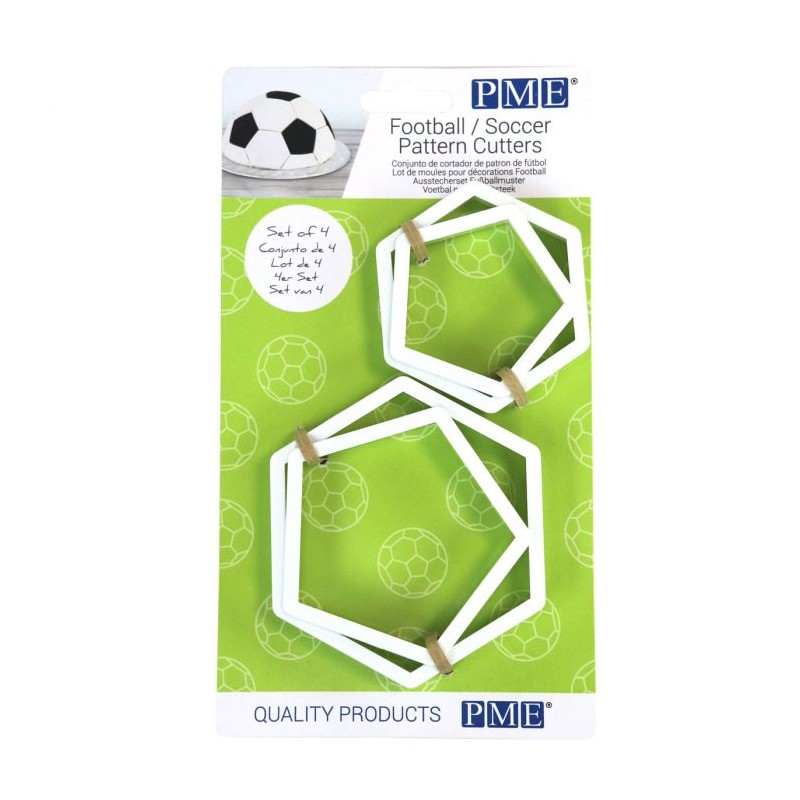 Simplemente haga un hermoso patrón de fútbol / fútbol con este práctico cortador de cuatro piezas de PME. Los cortadores pentagonales son adecuados para fondant, mazapán, pasta de goma y más. ¡El set es estupendo para hacer pasteles de fútbol y fútbol!