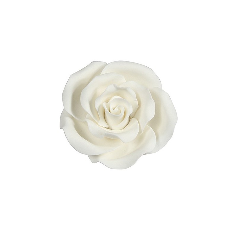 Esta hermosa rosa comestible hecha a mano en blanco está hecha de una pasta de azúcar suave que tiene un sabor agradable y ligero sabor a vainilla. La decoración de la torta de aspecto realista es perfecta para agregar a una exhibición floral en una boda o pastel de ocasiones especiales.