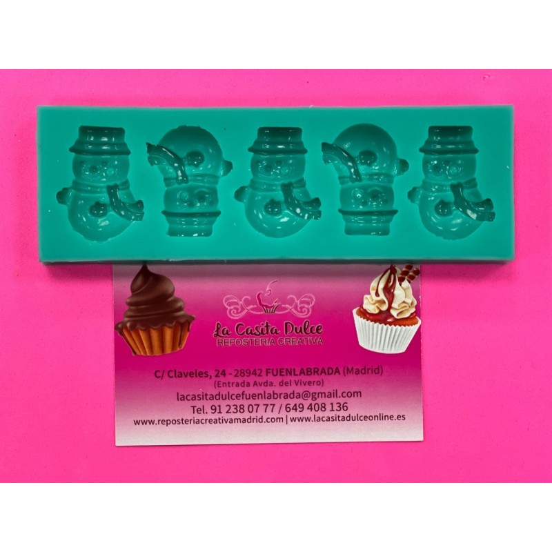 MOLDE SILICONA 5 MUÑECOS DE NIEVE CON GORRO Y BUFANDA