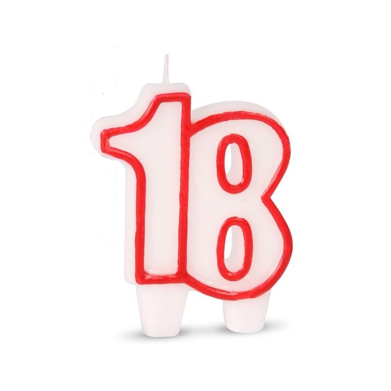 VELA DE CUMPLEAÑOS DEL NUMERO 18 EN COLOR BLANCO CON BORDE ROJO