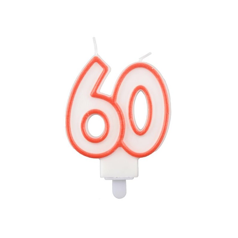 VELA DE CUMPLEAÑOS DEL NUMERO 60 EN COLOR BLANCO CON BORDE ROJO