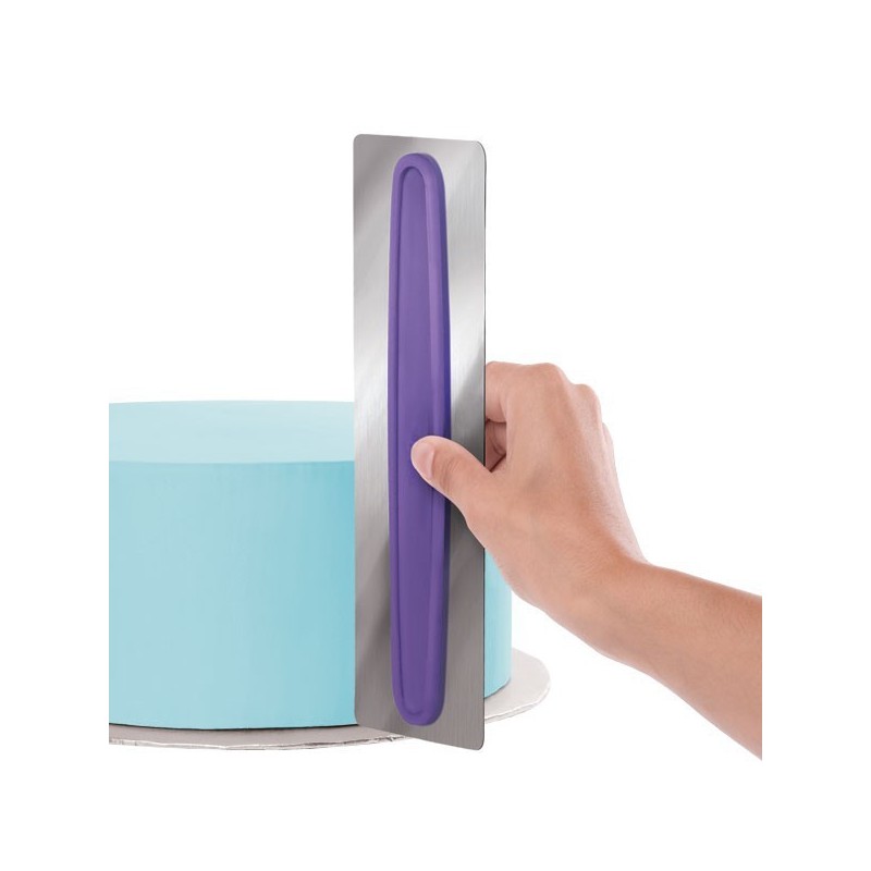 Este alisador tiene una elegante hoja de acero inoxidable que ayuda a crear partes superiores y lados de la torta perfectamente suaves. Tiene un tamaño específico para alturas de pastel estándar para suavizar fácilmente la formación de hielo. El fondo plano crea una superficie simple para descansar a lo largo del lado de la torta. La empuñadura está específicamente moldeada para un agarre seguro y cabe cómodamente en su mano.