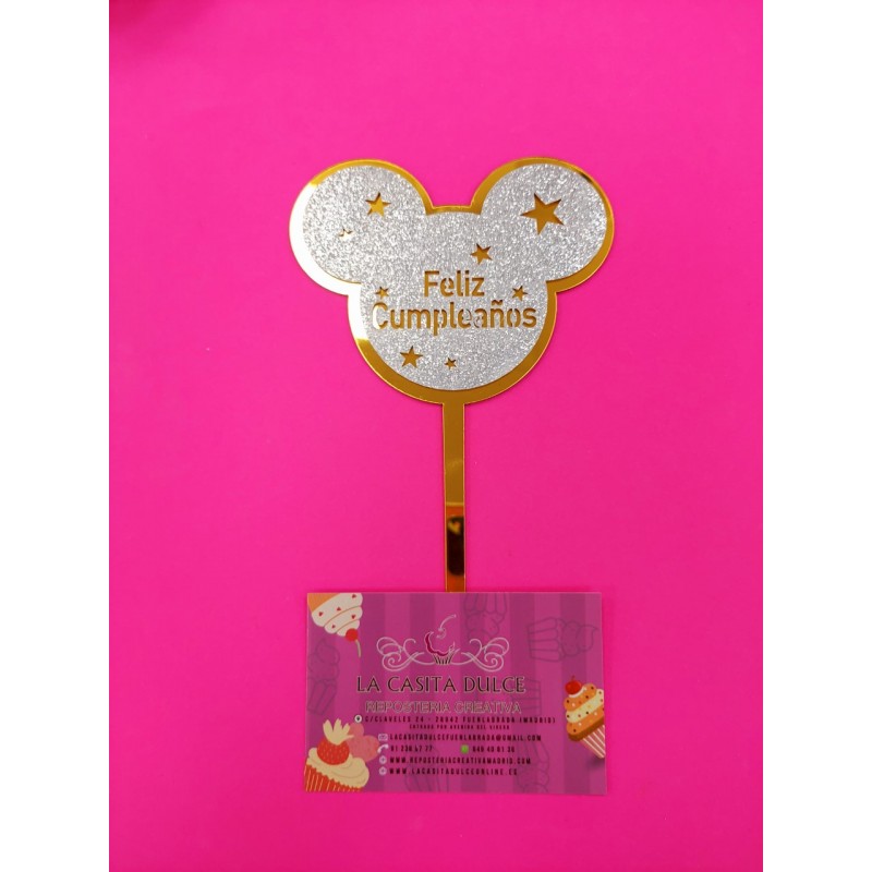 TOPPER FELIZ CUMPLEAÑOS MICKEY PLATA Y ORO
