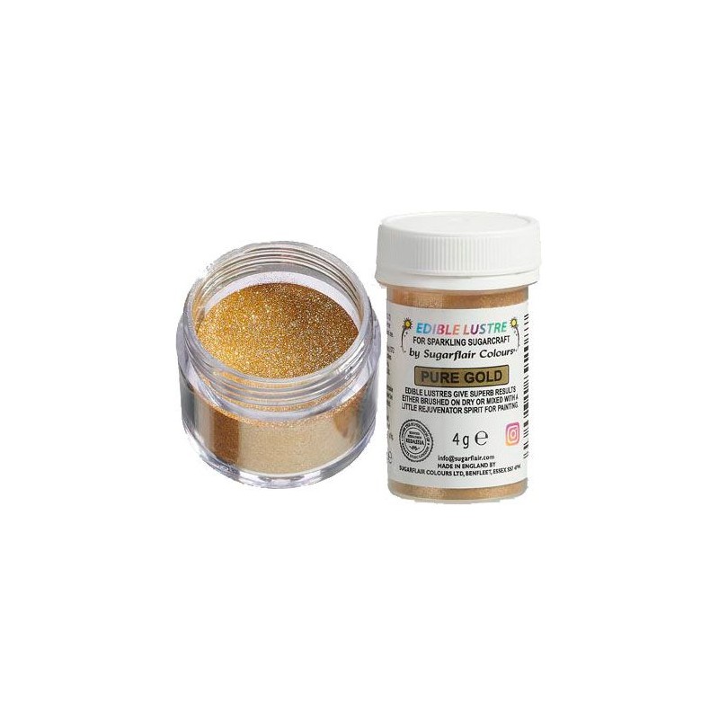 El Edible Lustre en Glitter Pure Goldde Sugarflair es un producto de primera calidad, versátil y seguro que da un bonito brillo a tus creaciones. El complemento perfecto para dar un toque extra a sus creaciones. Este Edible Lustre se puede aplicar directamente con un pincel y da a sus productos horneados un hermoso brillo que llamará la atención de todos.