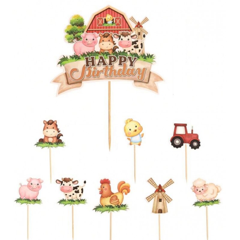 SET 9 TOPPERS ANIMALES DE LA GRANJA CARTON CUPCAKES Y TARTA