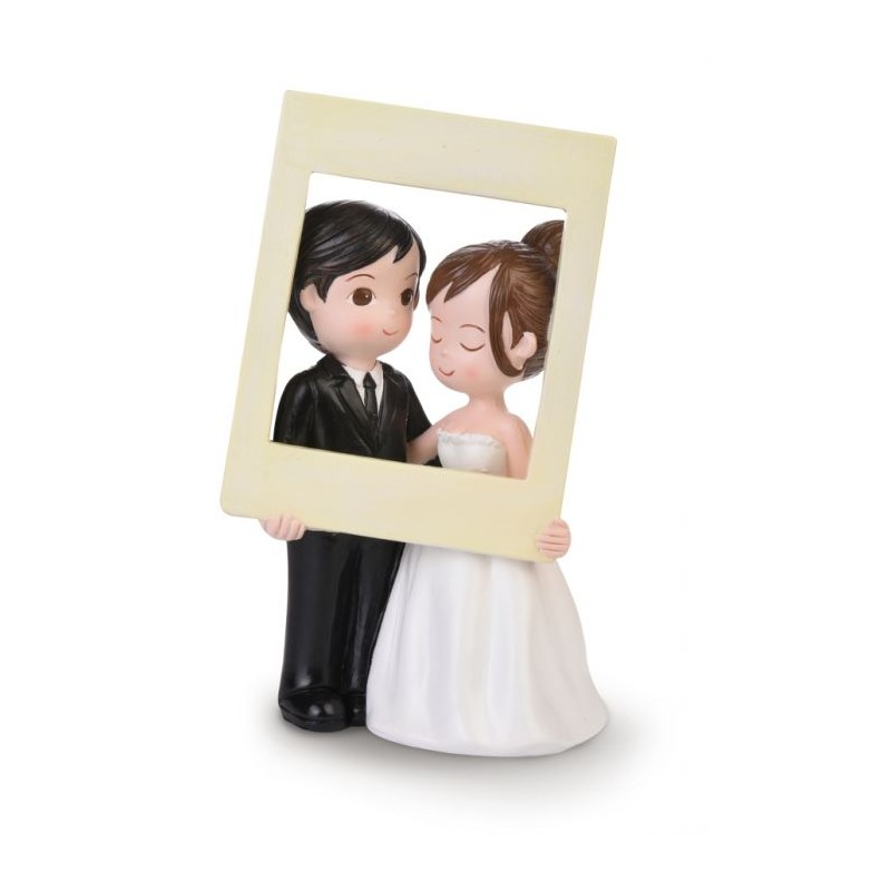 Bonita figura para tarta con los novios sujetando un marco de fotos