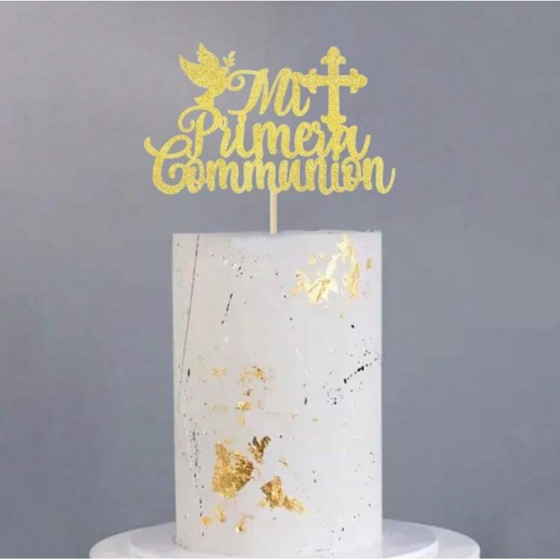 TOPPER PRIMERA COMUNION PALOMA Y CRUZ DORADO CARTON