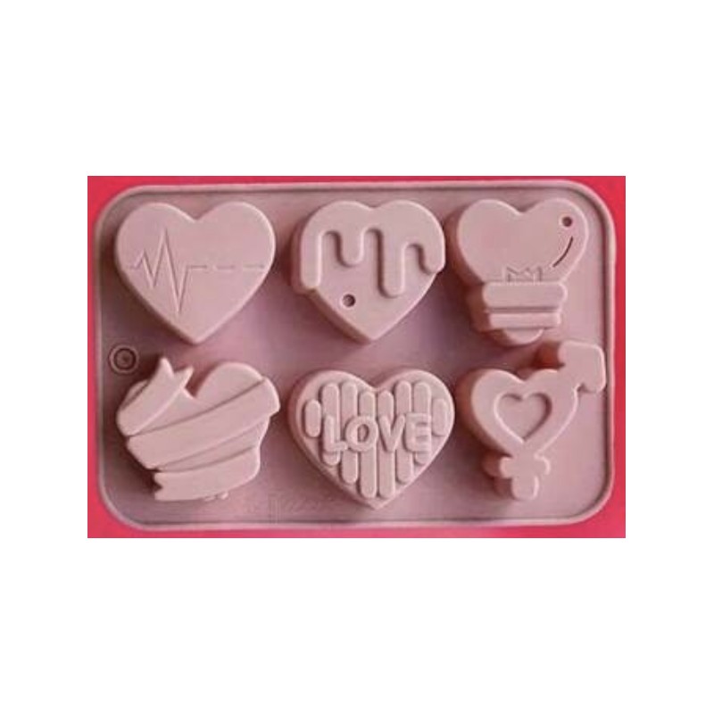 MOLDE SILICONA 6 CORAZONES DECORADOS